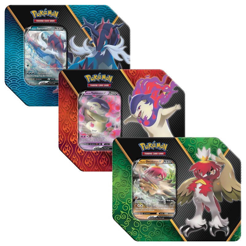 Divergent Powers USA Tins : 3 x USA Version Divergent Powers Tin : * 1 x Typhlosion V USA Tin * 1 x Decidueye V USA Tin * 1 x Samurott V USA Tin 5 x Pokemon TCG Booster Pack + 1 x V card! #Pokemon #TCG #Tin #TinArtSet #DivergentPowers #DivergentTins #PokemonUSATins #USATinSet #ArtSet